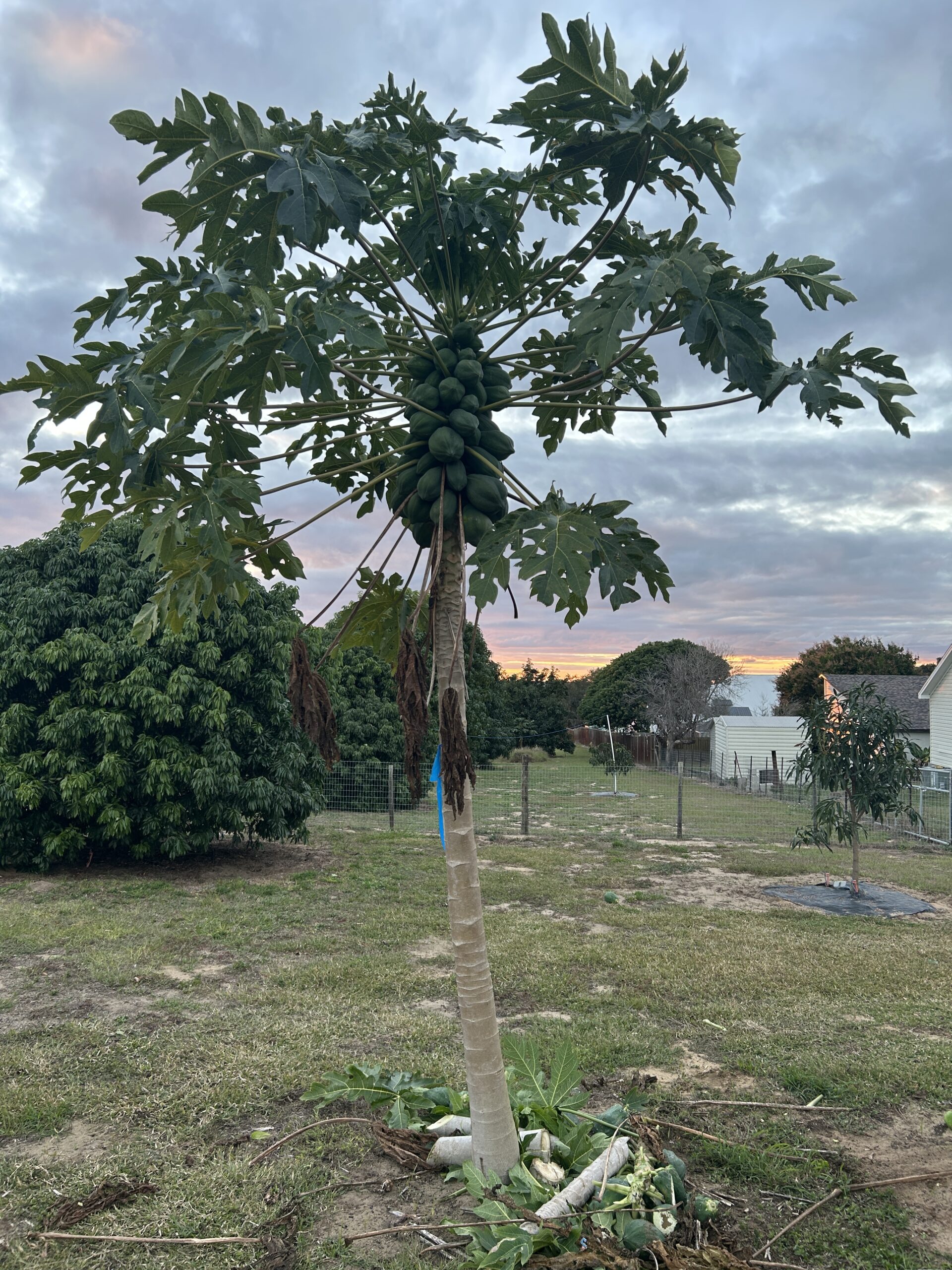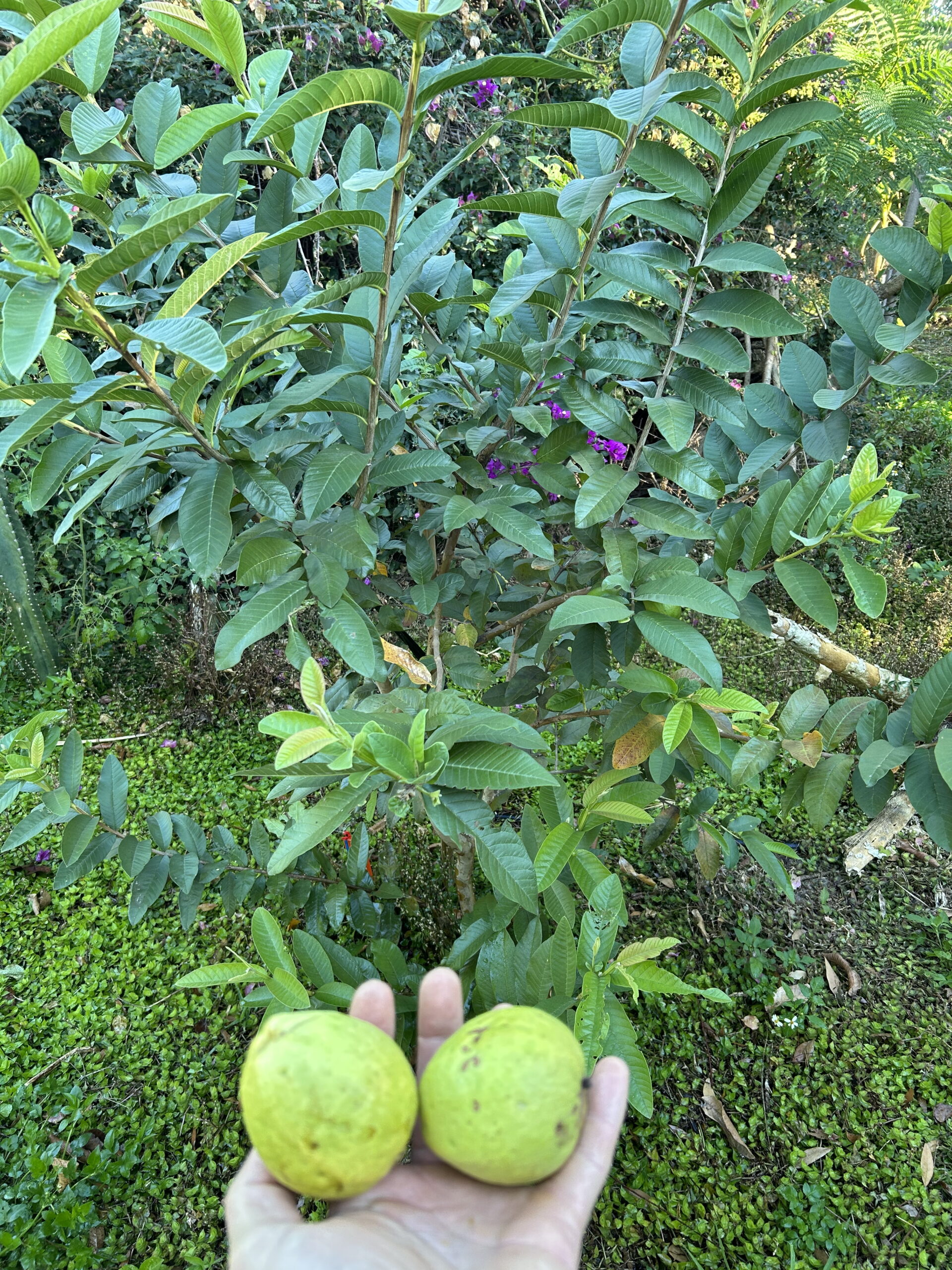 This guava seed comes from a local tree in our neighborhood. This tree bears the distinction of being the largest guava tree we have ever seen in the state of Florida. Older people in the neighborhood can’t remember a time when it was not there. This tree produces huge amounts of pear shaped guavas that are very sour. This sour flavor is not something we have encountered in Psidium guajava fruit before. Those who like sour fruit may enjoy them out of hand but the real potential may be as a processing fruit. Another possibility is that this tree could be a useful nematode resistant rootstock given that it has grown to be such a large tree while close by feral guavas are clearly stunted by nematodes. Outer rind is very thick and fruit fly infection seems to be minimal compared to other local trees.